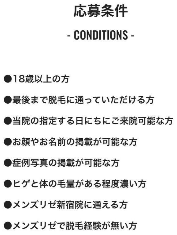 メンズリゼの脱毛モニターの条件は、下記の8つでした。