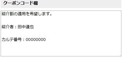 クーポンコード欄に「紹介者の氏名と診察券番号」を記入すればOKです。