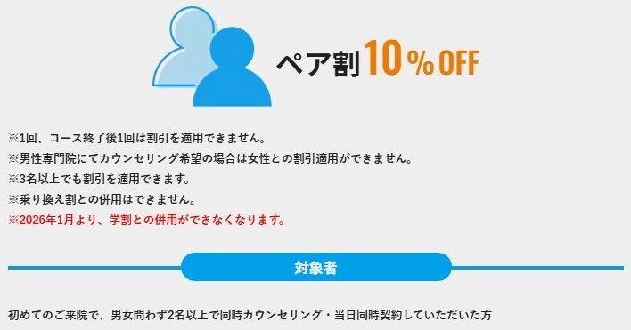 メンズリゼのペア割は、下記の割引と併用することができません。