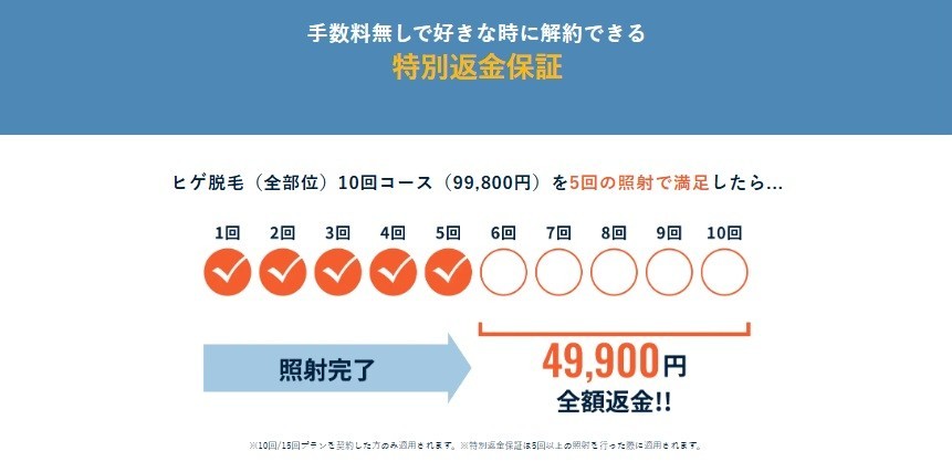 ヒゲ脱毛を10回以上のコースで契約して、5回終了後に満足したら、いつでも手数料なしで途中解約できる「特別返金保証」という制度があるからです。