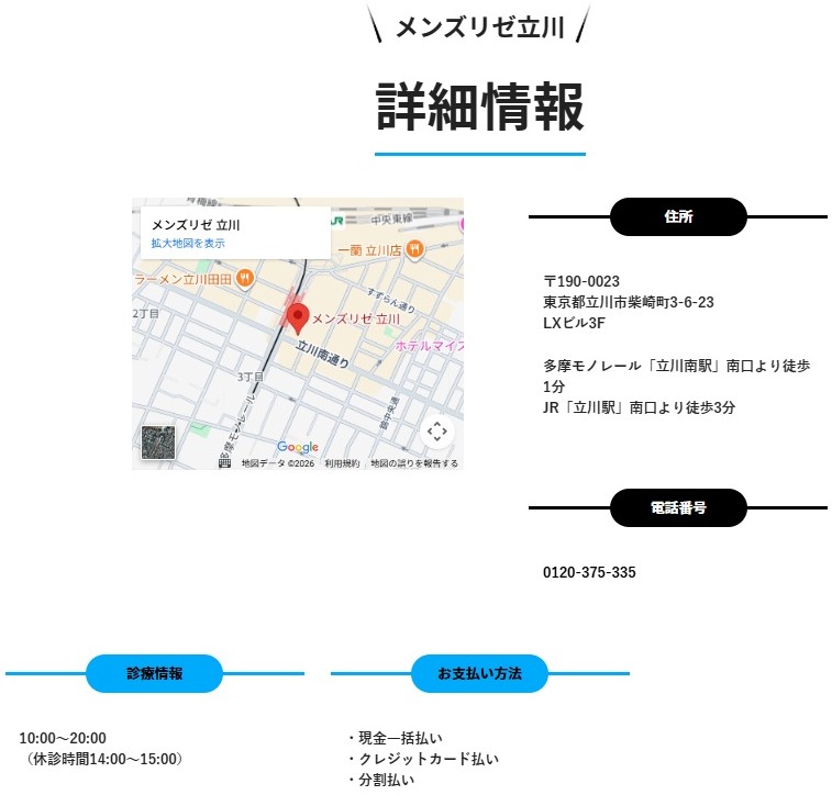 メンズリゼ立川院は、JR「立川駅」と多摩モノレール「立川南駅」の各駅から徒歩3分圏内にあります。