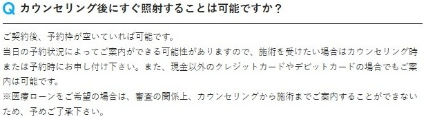 さらに、カウンセリング当日に契約し、予約枠に空きがあればそのまま施術まで受けられます。