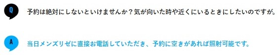 ただし、当日施術を希望する場合は、当日に電話で問い合わせて、空きがあれば予約できます。